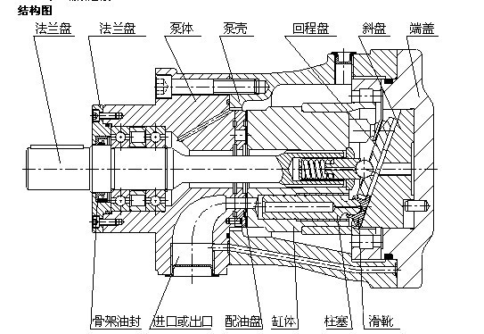 主体部分由传动轴带动缸体旋转,使均匀分布在缸体上的七个柱塞绕传动轴中心线转动,通过中心弹簧将柱滑组体中的滑靴压在变量头(或斜盘)上。这样柱塞随着缸体的旋转而作往复运动,完成吸油和压油动作。