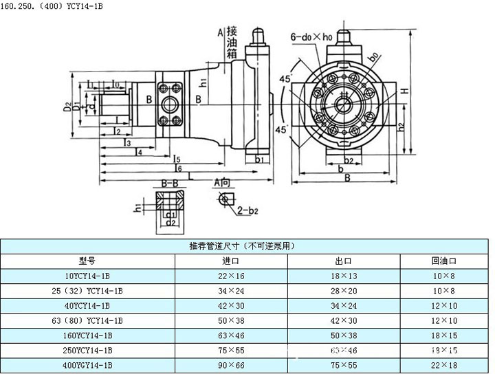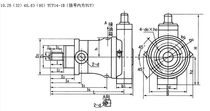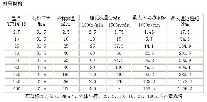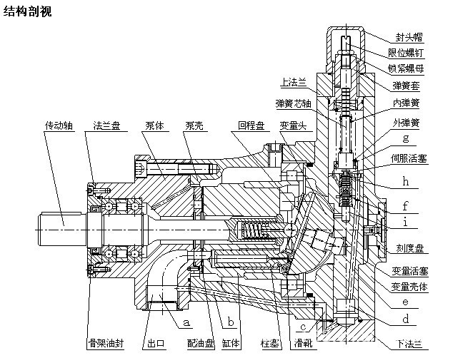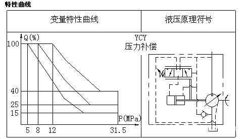 结构原理简述 该种变量形式的轴向柱塞泵是靠泵本身压力自动控制,如上图高压油流通过通道(a)、(b)、(c),进入变量壳体(302)的下腔(d),由此经过通道(e) 分别进入通道(f)和(h),当弹簧的作用力大于由通道(f)进入伺服活塞(309)下端环形面积的液压推力时,则油液经(h)进入上腔(g),推动变量活塞(301)向下移动,使泵的流量增加。 反之,当泵的压力克服弹簧力使伺服活塞向上动时,堵塞通道(h),使(g)腔油通过(i)而卸压,此时变量活塞上移,泵的流量减小。 下图表示YCY14-1B泵的变量特性曲线,其阴影表示特性调节范围。AB的斜率是由外弹簧(307)刚度决定的,BC的斜率是由外弹簧(307)和内弹簧(306)的合成刚度决定的,CD的长短取决于限位螺钉的位置(限制变量头的倾斜角)。 调节变量特性时,如需按A1B1C1D1规律变化,可先将限位螺钉拧至上端,然后调节弹簧套(305)使其流量刚发生变化时的压力与A1点的压力相符,再调节限位螺钉,使流量不再变化时的高压流量与D1点的流量相符,其中间压力与流量的变化关系是预先设计好的,不需要调整,只要A1和D1两点的流量、压力调好了,该泵就自动地按A1B1C1特性曲线变化。 这种变量型式的特性曲线是近似地按恒功率变化。上述特性的转换点A1和D1的参数可按以下方法计算: 例如:已知某一机器的工艺特性要求泵的最大压力为Pmax,在Pmax时D1点的流量为Q1,泵在低压时的流量为Qmax,则泵在A1点的压力为: 其中:ηP1—泵在P1的总效率 ηPmax—泵在Pmax的总效率 在本系列泵中,可取ηP1/ηPmax≈1 原动机的功率选择可以按下式: NH=Pmax·Q1/60η 其中η可取0.8-0.9(当Q1较小时取较小值,较大时取较大值。)
